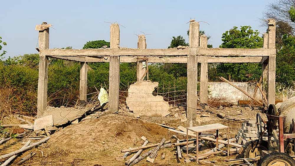 निर्माणाधीन श्मशान घाट का शेड हुआ धराशायी, घटिया निर्माण सामग्री का किया इस्तेमाल