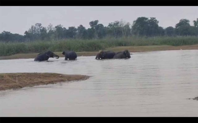 चार दंतैल हाथियों का एक दल तलाब में अठखेलियां करते आया नजर