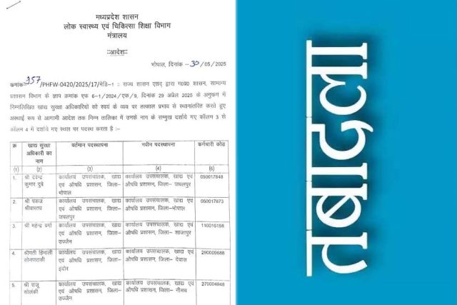 यह आदेश 30 मई 2025 को अवर सचिव सीमा डहेरिया द्वारा जारी किया गया। जिसमें भोपाल, जबलपुर, उज्जैन, इंदौर, पन्ना, हरदा, शाजापुर, डिंडोरी के अधिकारियों के स्थानांतरण किए गए। अस्थाई रूप से आगामी आदेश तक यह ट्रासफर अधिकारियों के स्वयं के व्यय पर तत्काल प्रभाव से किए गए।