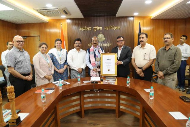 पुलिस मुख्यालय में शुक्रवार को वर्ल्ड बुक ऑफ रिकॉर्डस के सीईओ तथा प्रेसीडेंट संतोष शुक्ला ने पुलिस महानिदेशक कैलाश मकवाणा और एडीजी नारकोटिक्स के.पी. व्यंकटेश्वर राव से भेंट कर सर्टिफिकेट प्रदान किया। इस दौरान वर्ल्ड बुक ऑफ रिकॉर्डस संस्था की जनरल सेक्रेटरी डॉ. तिथि भल्ला तथा एडिटर सुअपूर्वा मेनन सहित अन्य अधिकारी उपस्थित थे।