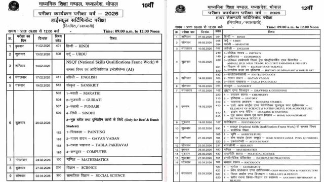 मध्य प्रदेश माध्यमिक शिक्षा मंडल की ओर से जारी टाइम टेबल के अनुसार, दोनों कक्षाओं का पहला पेपर हिंदी विषय का होगा। टाइम टेबल के अनुसार, 12वीं की परीक्षाएं 7 फरवरी से 3 मार्च 2026 तक चलेंगी। वहीं 10वीं की परीक्षाएं 11 फरवरी से 2 मार्च तक चलेंगी। परीक्षा का समय सुबह 9 बजे से लेकर 12 बजे तक निर्धारित है।