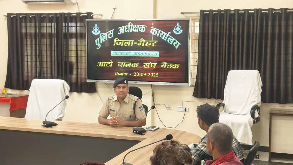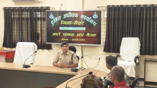 इसी क्रम में पुलिस अधीक्षक मैहर श्री अवधेश प्रताप सिंह के निर्देश पर  यातायात जागरुकता हेतू आज दिनांक 20/09/25 को यातायात प्रभारी नृपेंद्र सिंह द्वारा पुलिस अधीक्षक कार्यालय के सभागार में ऑटो चालकों की मीटिंग लेकर उन्हें यातायात नियमों का पालन करने और सड़क सुरक्षा के महत्व के बारे में बताया गया। यातायात नियमों का पालन करना न केवल ऑटो चालकों बल्कि यात्री की सुरक्षा के लिए भी आवश्यक है। ऑटो चालकों को गति सीमा का पालन करने एवम सड़क पर सावधानी से वाहन चलाने की समझाइश दी गई।