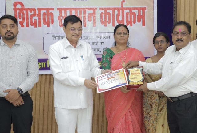 वाणिज्य,  उद्योग, श्रम,  आबकारी एवं सार्वजिक उपक्रम मंत्री  लखन लाल देवांगन के मुख्य आतिथ्य में आज सोमवार को कोरबा स्थित कलेक्टोरेट सभाकक्ष में शिक्षक सम्मान समारोह का आयोजन किया गया। कार्यक्रम में जिले के राज्यपाल पुरस्कार से सम्मानित शिक्षक, सेवानिवृत्त शिक्षक एवं नवाचारी शिक्षकों को पुष्पमाला एवं तिलक लगाकर सम्मानित किया गया। इस अवसर पर महापौर मती संजू देवी राजपूत, जिला पंचायत अध्यक्ष डॉ. पवन सिंह,  नगर निगम सभापति  नूतन सिंह ठाकुर , निगम आयुक्त  आशुतोष पांडेय, सीईओ जिला पंचायत  दिनेश नाग, डीईओ  टी पी उपाध्याय सहित अन्य जनप्रतिनिधि एवं शिक्षा  विभाग के अधिकारी कर्मचारी उपस्थित थे।