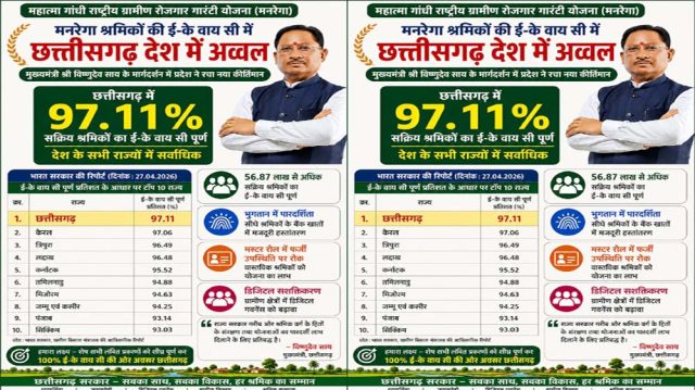महात्मा गांधी राष्ट्रीय ग्रामीण रोजगार गारंटी योजना (मनरेगा) के अंतर्गत श्रमिकों के ई-के वाय सी कार्य में छत्तीसगढ़ ने पूरे देश में प्रथम स्थान प्राप्त कर उल्लेखनीय उपलब्धि हासिल की है। भारत सरकार द्वारा जारी ताजा रिपोर्ट के अनुसार प्रदेश में 97.11 प्रतिशत सक्रिय श्रमिकों का ई-के वाय सी पूर्ण कर लिया गया है, जो राष्ट्रीय स्तर पर सर्वाधिक है। खास बात यह है कि छत्तीसगढ़ ने केरलम, त्रिपुरा, मिजोरम जैसे छोटे राज्यों तथा कर्नाटक, तमिलनाडु जैसे बड़े राज्यों को भी पछाड़कर यह उपलब्धि हासिल की है।